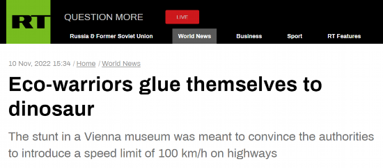 “恐龙”也被盯上了?综合“今日俄罗斯”(RT)、奥地利新闻门户网站Oe24报道,两名气候活动人士于当地时间10日将自己“粘在”奥地利维也纳自然历史博物馆的恐龙骨架展台上,抗议政府的化石燃料政策,并呼吁降低高速限速,作为减少二氧化碳排放的“直接措施”。