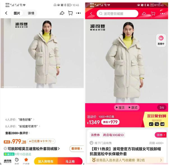 据媒体报道,来自上海的市民李女士称,她原计划在淘宝波司登旗舰店购买一件羽绒服。9月份时平台的价格是券后979.28元,没想到在双十一预售期间,该款羽绒服的价格提升至1349元,领券购买后实际价格仍为979元,仅比9月份价格便宜0.28元。