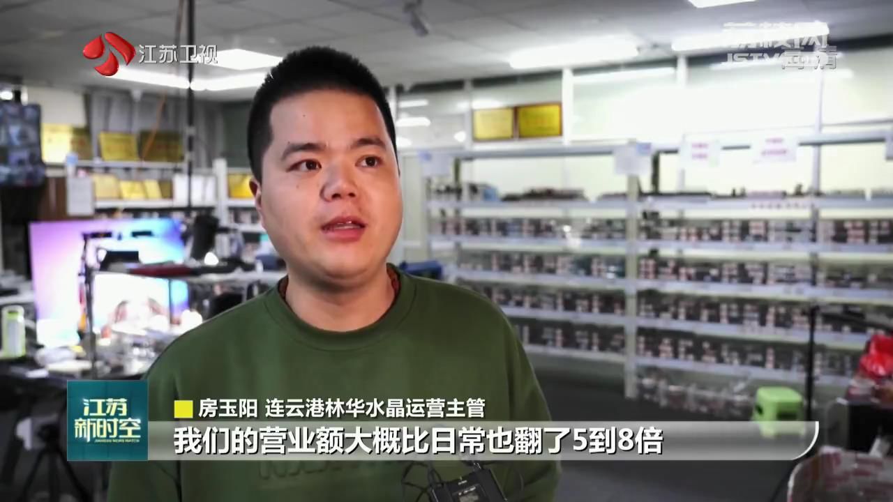 连云港林华水晶运营主管房玉阳说:“我们的营业额比平常也翻了5到8倍,每一场的带货直播保底在10万元以上。”