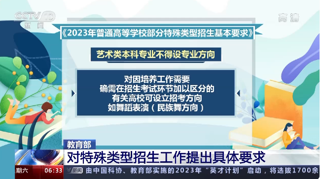 教育部下发的《2023年普通高等学校部分特殊类型招生基本要求》对高校艺术类专业、高水平艺术团、高水平运动队、保送生等特殊类型招生工作提出了具体要求。