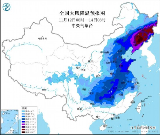 受较强冷空气影响,11月12日8时至14日8时,内蒙古中东部、东北地区大部、华北、黄淮、江淮、江汉、江南西部和北部,以及四川东部、重庆、贵州大部等地气温将下降4℃至8℃,其中,内蒙古东南部、辽宁中东部、吉林中东部部分地区降温超过10℃,局地降温可达14℃以上。上述地区将先后出现4级至6级偏北风,阵风可达7级至8级。