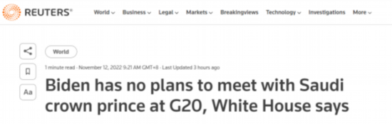 据路透社报道,美国总统国家安全事务助理沙利文11月11日表示,美国总统拜登不打算在G20峰会期间与沙特阿拉伯王储萨勒曼举行会谈。