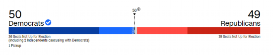 截至目前,民主党已经取得了国会参议院的50席,取得参议院控制权。
