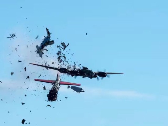 美媒称,美国得克萨斯州达拉斯县12日一次航展的飞行表演中,一架B-17轰炸机和一架P-63战斗机相撞并坠毁,图自美媒
