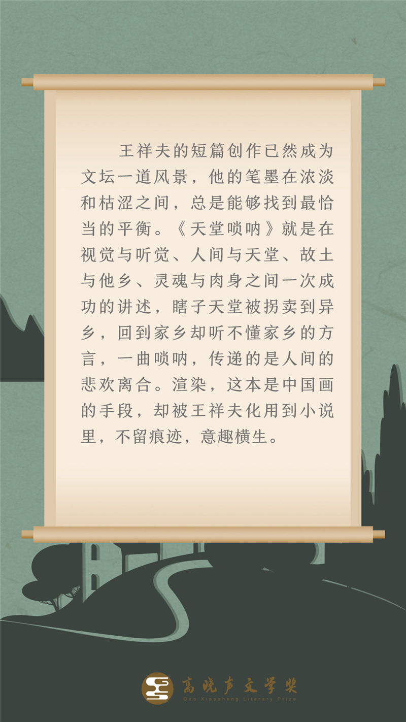 王祥夫:原来上海办过一个很好的刊物叫《新闻与小说》,这个刊物后来停刊了,但在二十多年前它的影响是很大的,它让我们学会从新闻媒体上找寻写作的素材。而《天堂唢呐》的原型故事,就是一个六岁的孩子当年在村子里失踪了,被拐卖掉了,当他六十一岁回来时,当年聪明漂亮、两只大眼睛亮亮的小孩,却已经是一位双目失明的老人。这个故事一下子触碰到了我的泪点,真是令人心碎,这让我想到了古诗《十五从军征》:“十五从军征,八十始得归。”我当时就觉得我要写个小说,写他六岁被人贩子拐走,六十一岁才回到家中,写双目失明的他跪在父母的坟前吹唢呐。他失明,他是怎么失明的,他在这些年里都遭遇到了什么,这些我都在小说里没有交代,我要让读者自己去想,短篇小说是要留下大幅的空白给读者去想象的。