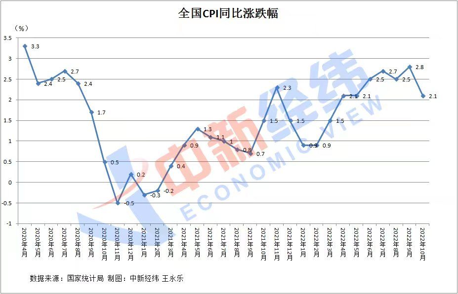 中新经纬消息,国家统计局数据显示,2022年10月,全国CPI环比上涨0.1%,同比上涨2.1%。同比涨幅较9月明显回落,且连续第4个月低于市场预期。详情>>