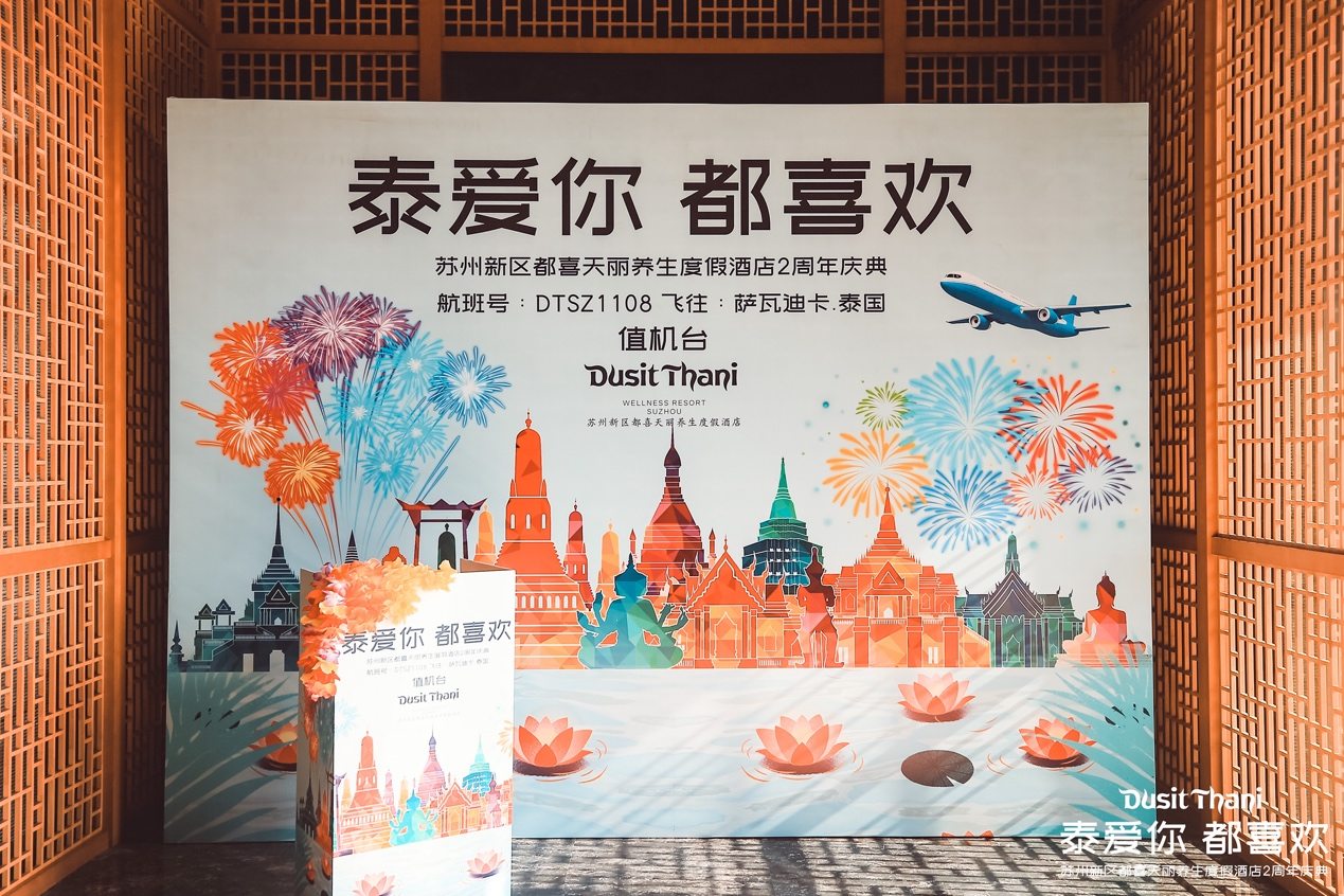 2022年11月8日,正值苏州新区都喜天丽养生度假酒店之际,酒店结合品牌文化内涵与年轻人微度假、轻养生的休闲需求,打造本次「泰爱你,都喜欢」两周年庆典活动,特邀泰国国家旅游局上海办事处负责人、都喜富都酒店集团代表、酒店总经理、业主方以及社会各界嘉宾共同开启本次沉浸式泰国文化之旅。11月8日下午,各位贵宾凭本次活动邀请函——“飞往泰国的都喜登机牌”在酒店门口的登机导台办理“值机”手续后,共同踏上了这场自在舒适的离尘之旅。