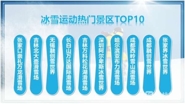 截至目前预订数据显示,在冰雪运动主题中,张家口崇礼万龙滑雪场、吉林北大壶滑雪场、无锡融创雪世界、长白山万达国际滑雪场、吉林万科松花湖滑雪场、深圳世界之窗阿尔卑斯冰雪世界、哈尔滨亚布力滑雪场、成都西岭雪山滑雪场、成都融创雪世界、张家界冰雪世界等景区的热度更胜一筹。