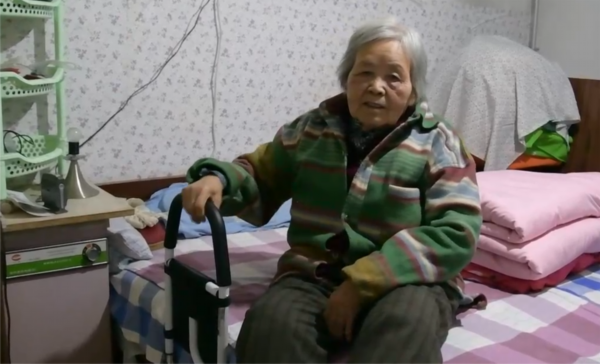 85岁的于宜芳正在试用床边安装的护具。新华社记者李亚楠 摄