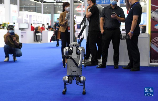 11月15日,在第二十四届中国国际高新技术成果交易会上,杭州一家公司的机器狗在进行性能展示。新华社记者 毛思倩 摄
