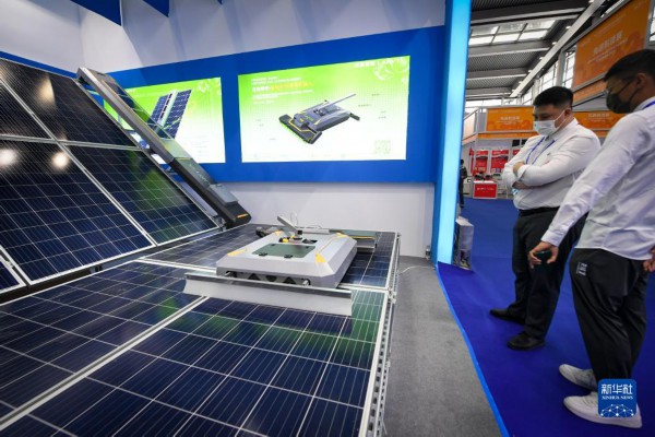 11月15日,在第二十四届中国国际高新技术成果交易会上,参观者了解一款智能光伏清洁机器人。新华社记者 毛思倩 摄