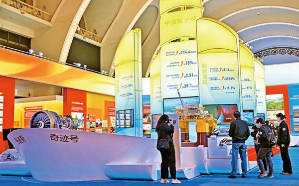 党的十八大以来,以习近平同志为核心的党中央提出并贯彻新发展理念,着力推进高质量发展,推动构建新发展格局,实施供给侧结构性改革,制定一系列具有全局性意义的区域重大战略,我国经济实力实现历史性跃升。图为2022年10月8日,观众在“奋进新时代”主题成就展中央综合展区内参观拍摄中国经济“奇迹号”巨轮模型。 新华社记者 李鑫/摄