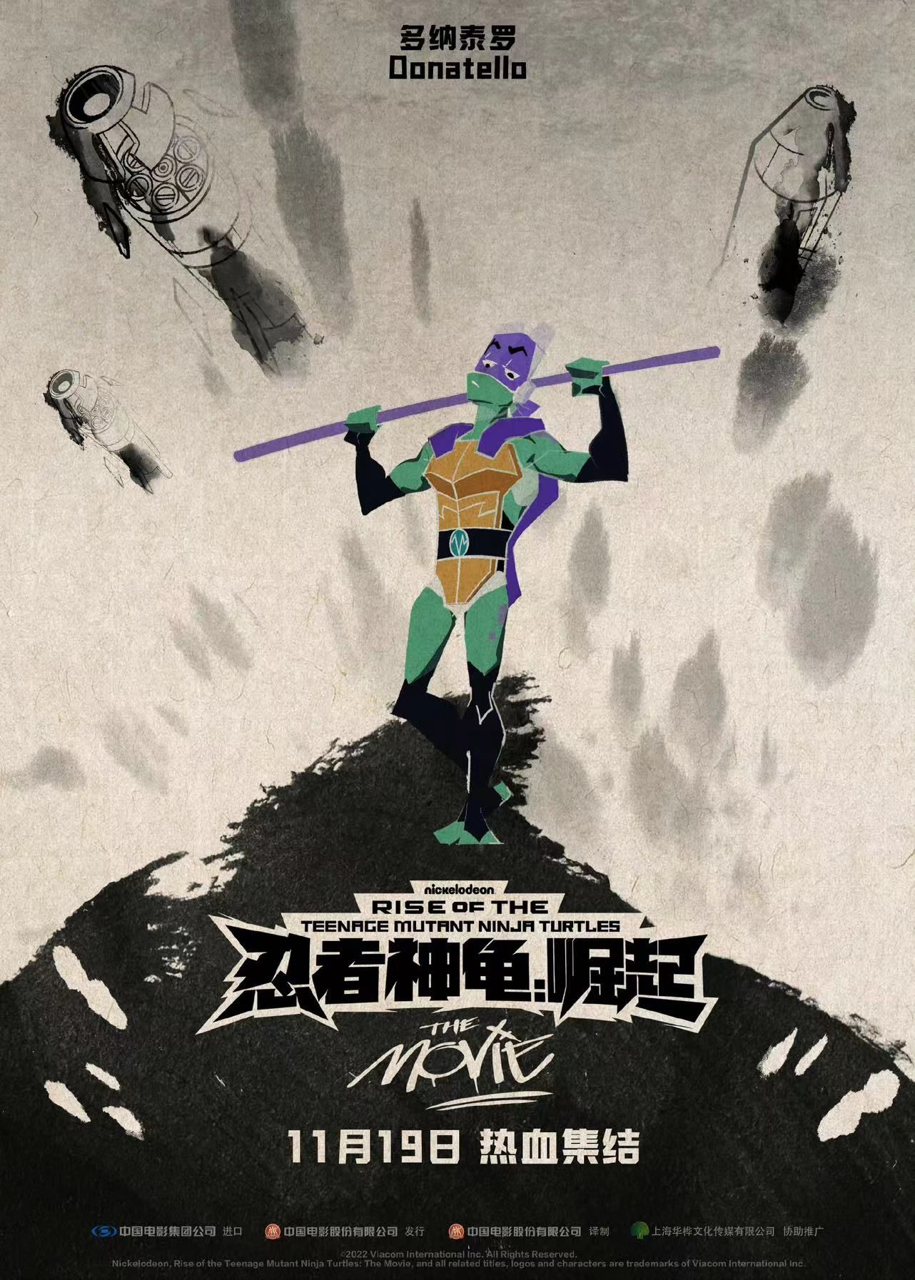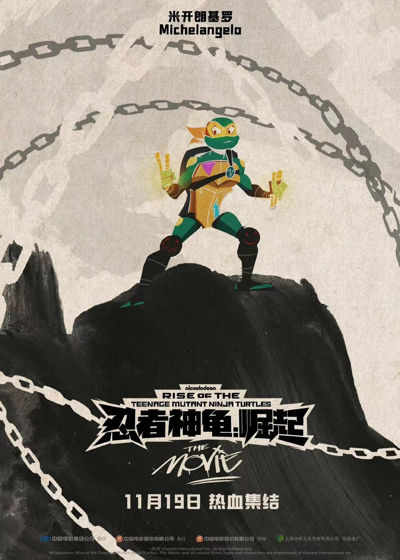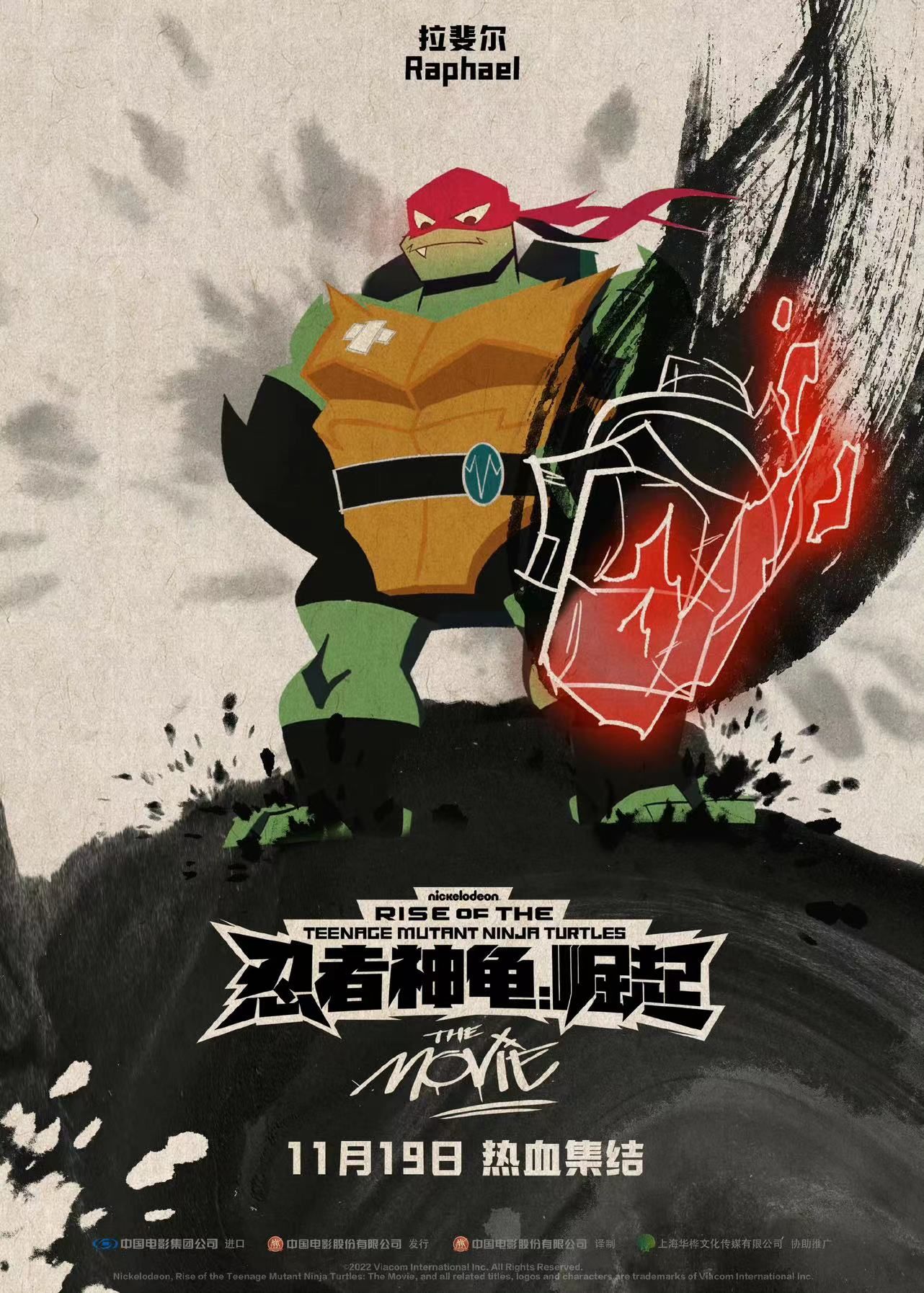 全球知名IP《忍者神龟》系列全新动画电影《忍者神龟:崛起》今日发布中国定制版水墨风角色海报,独具东方韵味。莱昂纳多、拉斐尔、米开朗基罗、多纳泰罗、凯西琼斯、斯普林特和艾普奥尼尔七大角色全员亮相,为中国观众带来水墨风惊喜。影片即将在11月19日全国上映,预售现已开启,去影院见证神龟们的热血战斗吧!