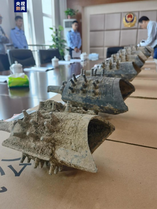 九件青铜编甬钟:是江西省公安厅组织九江市公安局刑警支队、共青城市公安局侦破“5.17”特大倒卖青铜编钟案而缴获的,这是近年来江西破获的特大倒卖文物案之一。编钟年代约在西周晚期,距今约2700年,铸造精湛,工艺高超,纹饰精美,保存基本完好,国内出土的周代成组编钟十分罕见,成组九件出现代表遗存等级很高,成套编钟在江西省也属首次发现,整体鉴定为国家二级文物。