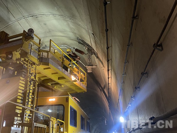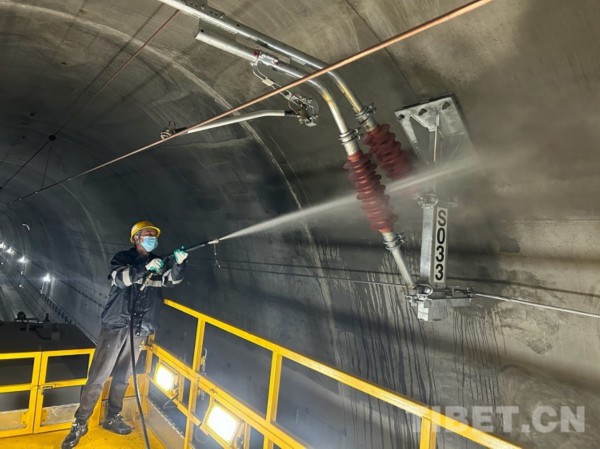 中国西藏网讯 初冬时节,雅鲁藏布江畔,秋叶缤纷、层林尽染。在穿山过江的拉林铁路桑珠岭隧道内机器轰鸣、人声鼎沸。11月14日10时25分,中国铁路青藏集团有限公司拉萨基础设施段桑日综合维修车间的接触网工陈世召头戴安全帽、身穿防雨服、脚踩绝缘靴,手中的高压水枪迸射出道道白色弧线。