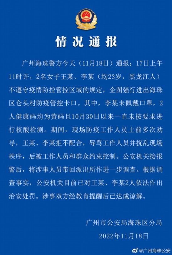 荔枝新闻讯 据广州海珠警方通报:17日上午11时许,2名女子王某、李某(均23岁,黑龙江人)不遵守疫情防控管控区域的规定,企图强行进出海珠区仑头村防疫管控卡口。其中,李某未佩戴口罩,2人健康码均为黄码且10月30日以来一直未按要求进行核酸检测。期间,现场防疫工作人员上前多次劝导,王某、李某拒不配合,辱骂工作人员并扰乱现场秩序,后被工作人员和群众约束控制。