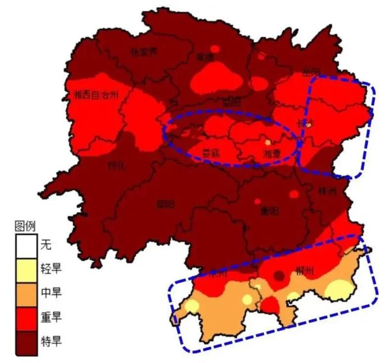 8月上旬开始,气象干旱迅速发展加重。截至10月24日,湖南地区气象干旱综合强度成为1961年以来历史第1位。湘北地区9月20日至23日、10月6日至9日、26日至30日, 湘南南部11月2日晚至6日受降雨和人工增雨作业影响,干旱情况有所缓和。目前气象干旱过程已持续118天。