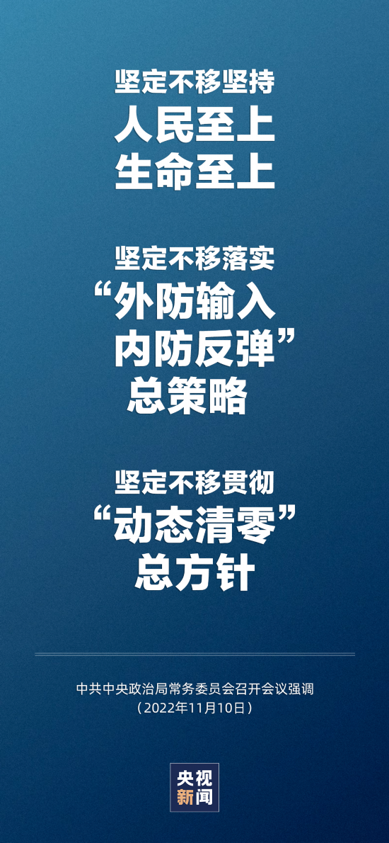 坚持三个“坚定不移”,就是坚定不移坚持人民至上、生命至上,坚定不移落实“外防输入、内防反弹”总策略,坚定不移贯彻“动态清零”总方针。这些话我们都很熟悉,这也是我们战“疫”的核心理念,并没有改变。二十条措施的核心是优化调整,是进一步提升防控的科学性、精准性、有效性,而不是放松防控,更不是放开、“躺平”。 当前,疫情防控形势仍然严峻,我们必须要保持住定力。