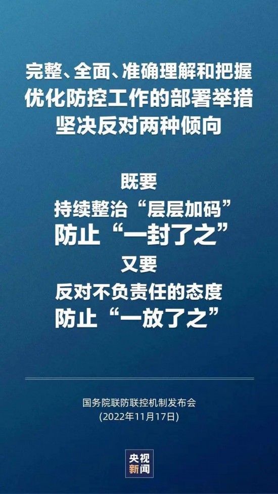昨天(17日),国务院联防联控机制召开发布会,介绍不折不扣、科学精准落实疫情防控优化措施的情况。这里有两个关键词,“不折不扣”“科学精准”。怎么理解呢?总结起来,就是坚持三个“坚定不移”,坚决反对两种倾向。