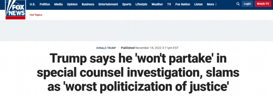 “我从来没有听说过这样的事情。他们什么都没发现。我宣布了这件事(竞选总统),然后他们任命了一名特别检察官,”特朗普说,“他们被允许这样做甚至令人难以置信。这是我们国家最严重的司法政治化。”