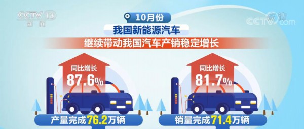 10月份,我国新能源汽车产销分别完成76.2万辆和71.4万辆,同比分别增长87.6%和81.7%,继续带动我国汽车产销稳定增长。10月份,多家自主品牌的新能源车销量均实现较大幅度的同比增长。