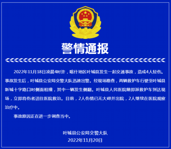 新疆喀什叶城县发生救护车侧面相撞事故,造成4人轻伤,交警通报