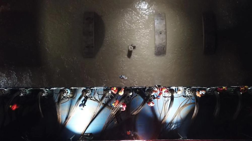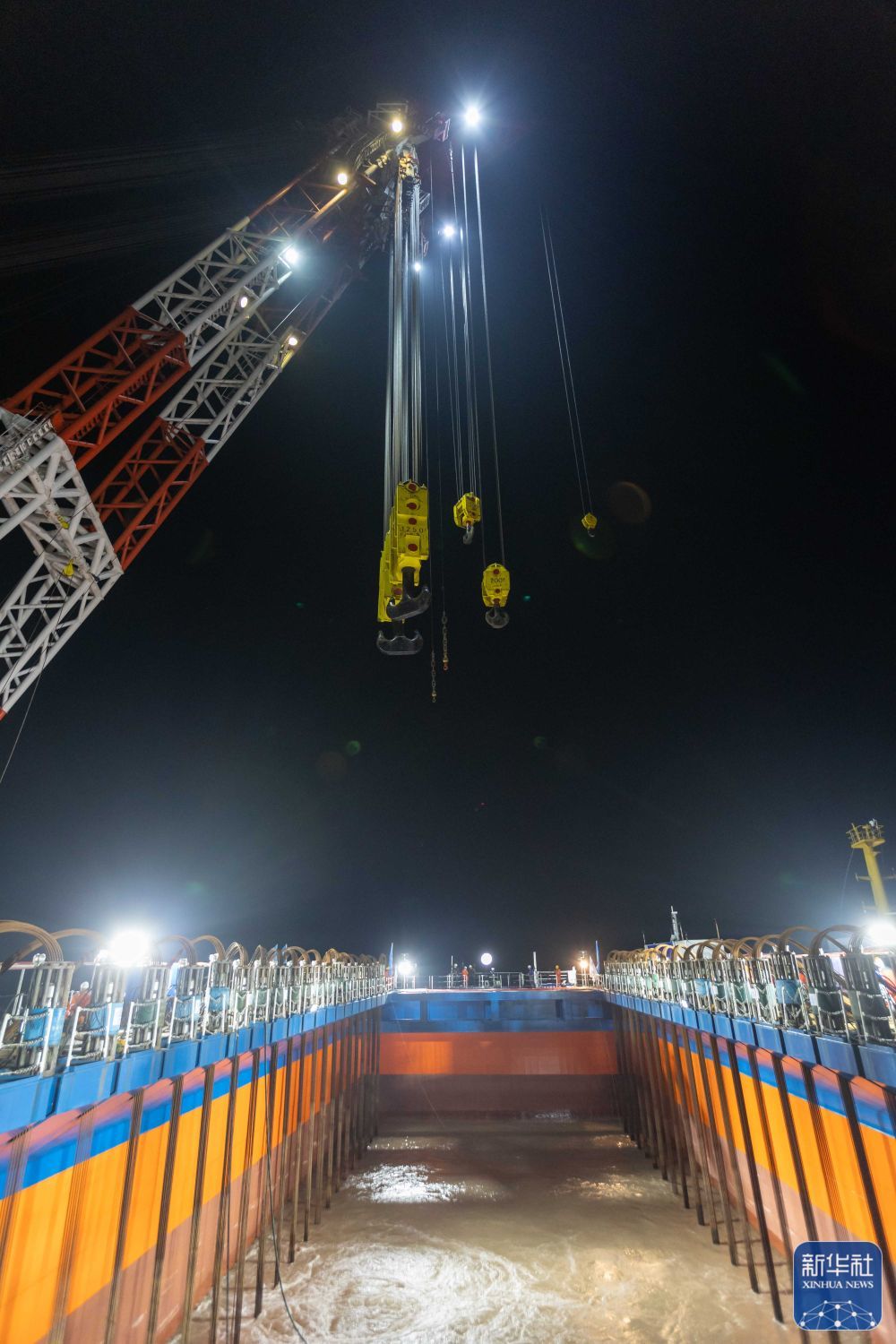 ↑11月21日,工作人员下水给桅杆“穿上”保护衣。