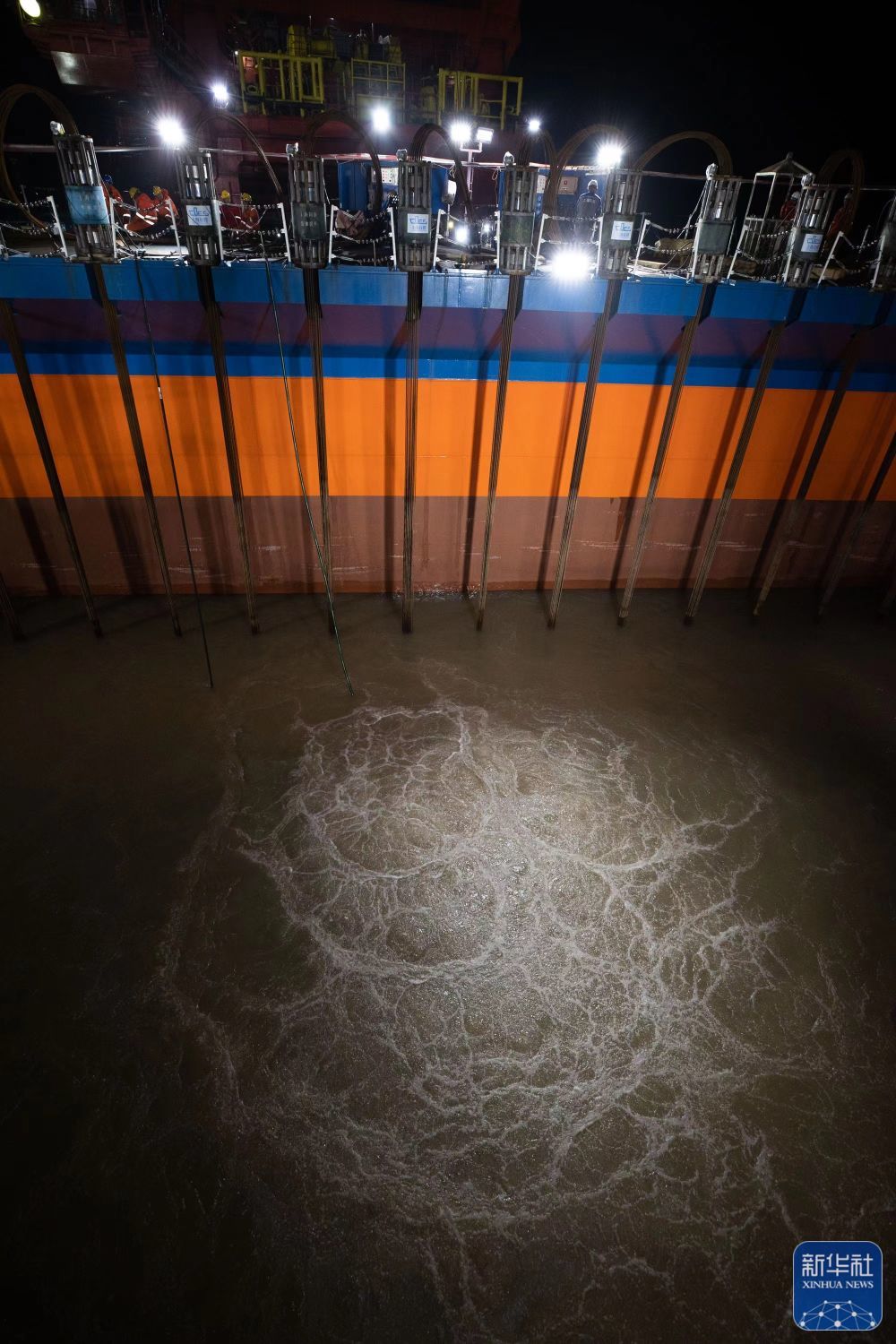 ↑11月21日,工作人员下水给桅杆“穿上”保护衣(无人机照片)。