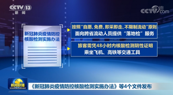 《新冠肺炎疫情防控核酸检测实施办法》明确:在常态化监测中,没有发生疫情的地区,一般不按行政区域开展全员核酸检测。按照“自愿、免费、即采即走、不限制流动”原则,面向跨省流动人员提供“落地检”服务,旅客需凭48小时内核酸检测阴性证明乘坐飞机、高铁等交通工具。对入住宾馆酒店和进入旅游景区人员需查验健康码和72小时内核酸检测阴性证明。