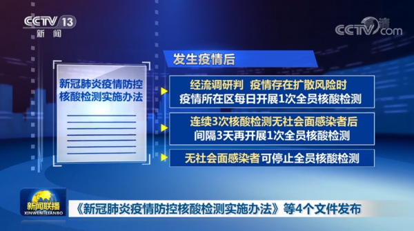 央视网消息(新闻联播):国务院联防联控机制今天(11月21日)发布了《新冠肺炎疫情防控核酸检测实施办法》等4个防控相关技术文件,对核酸检测、风险区划定、居家隔离和健康监测等做了进一步规范。