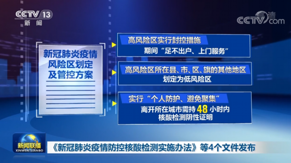 《新冠肺炎疫情风险区划定及管控方案》明确了风险区划定标准及相应的防控措施和解除标准。高风险区一般以单元、楼栋为单位划定。在疫情传播风险不明确或存在广泛社区传播的情况下,可适度扩大高风险区划定范围。高风险区实行封控措施,期间“足不出户、上门服务”。高风险区所在县、市、区、旗的其他地区划定为低风险区。实行“个人防护、避免聚集”,离开所在城市需持48小时内核酸检测阴性证明。