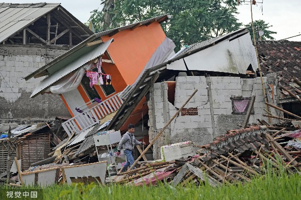 当地时间2022年11月22日,印度尼西亚西爪哇省,一名男子正从被地震摧毁的房屋废墟中走过。