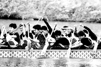 10月1日,在天津师范大学举行的“龙腾中国梦”校园龙舟赛上,大学生们在奋力挥桨进行比赛。刘东岳摄/光明图片