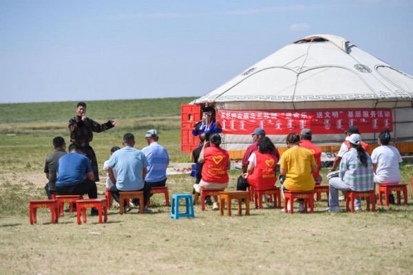每次演出前,乌兰牧骑队员会向牧民群众宣讲防疫、防火、畜牧业生产等知识,也常帮牧民打草、清理羊圈。
