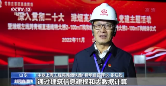 中铁上海工程局潍烟铁路6标项目指挥长 张红乾:通过建筑信息建模和大数据计算,提前模拟出转体过程中可能出现的问题,并依据转体速度、角度、扭力等关键数据,制定针对性解决预案。