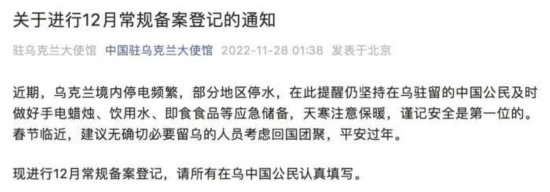 中国驻乌克兰大使馆在通知中称,近期,乌克兰境内停电频繁,部分地区停水,在此提醒仍坚持在乌驻留的中国公民及时做好手电蜡烛、饮用水、即食食品等应急储备,天寒注意保暖,谨记安全是第一位的。春节临近,建议无确切必要留乌的人员考虑回国团聚,平安过年。