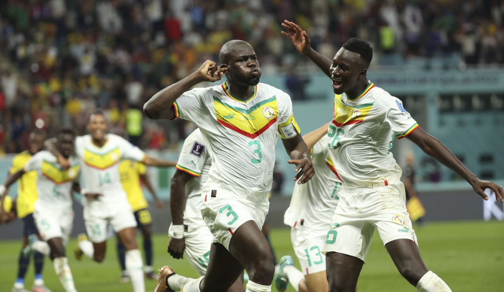 11月29日,塞内加尔队球员库利巴利(前左)在比赛中进球后庆祝。新华社记者 潘昱龙 摄