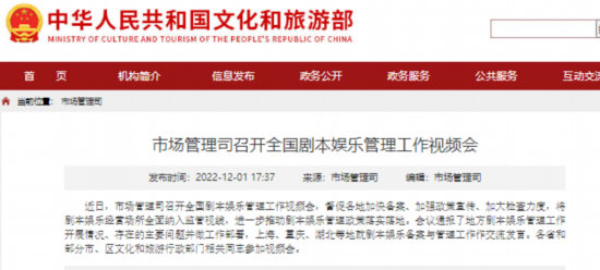 据文化和旅游部网站消息,近日,市场管理司召开全国剧本娱乐管理工作视频会,督促各地加快备案、加强政策宣传、加大检查力度,将剧本娱乐经营场所全面纳入监管视线,进一步推动剧本娱乐管理政策落实落地。会议通报了地方剧本娱乐管理工作开展情况、存在的主要问题并做工作部署,上海、重庆、湖北等地就剧本娱乐备案与管理工作作交流发言。各省和部分市、区文化和旅游行政部门相关同志参加视频会。