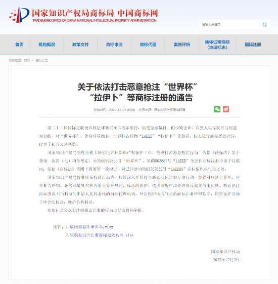 12月2日,国家知识产权局商标局网站发布通告,依法打击恶意抢注“世界杯”“拉伊卜”等商标注册。通告提出,少数企业、自然人以谋取不当利益为目的,对“世界杯”、著名球星姓名、世界杯吉祥物“LAEEB”“拉伊卜”等热词、标志进行商标恶意抢注,侵害了社会公共利益。