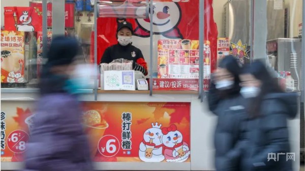 等待顾客上门的餐饮店店员(央广网记者 贾海元 摄)
