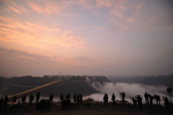 2011年初秋,大桥刚刚完成悬索安装时,我登上施工“猫道”。虽明知安全无虞,但站上去的那一刻,山风劲猛,深沟险壑间云雾翻滚,我还是被吓到,双腿不受控制地开启“震动”模式。适应了很长一段时间,我才渐渐摆脱恐惧,走向大桥中间,近距离拍摄施工现场。