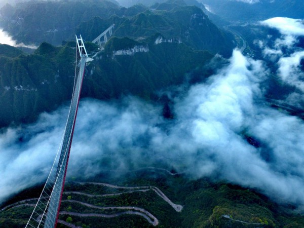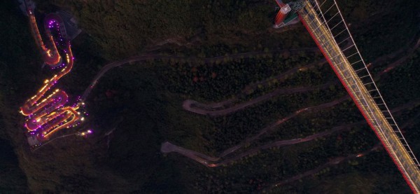 ↑ 2021年12月拍摄的矮寨大桥和盘山公路。