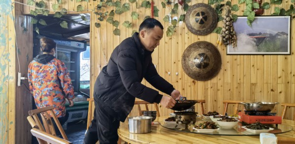 ↑ 2022年3月28日,幸福村的黄勇在“农家乐”招待客人。