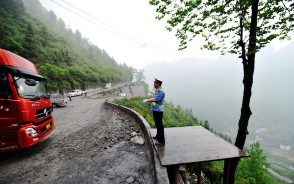 ↑ 2011年5月,交警在矮寨盘山公路用木板临时搭建的指挥台上疏导交通。