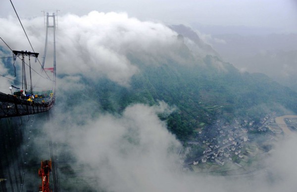 ↑ 2011年5月2日拍摄的施工中的矮寨大桥。