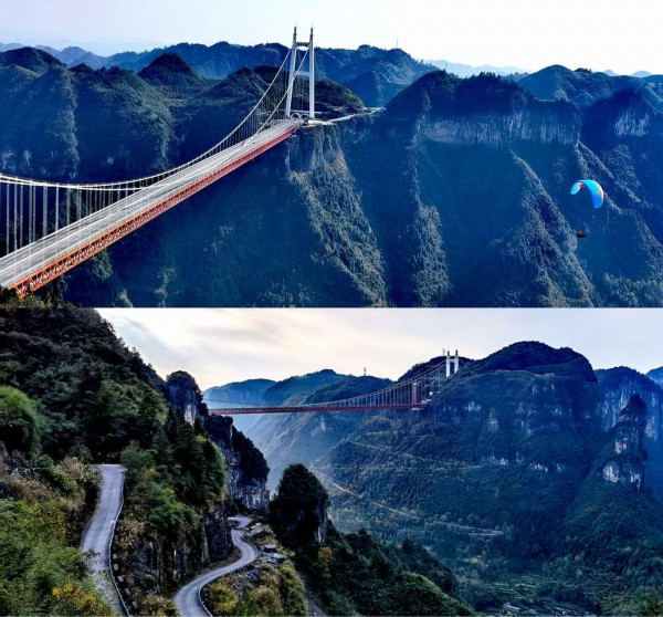 ↑拼版照片上图:2021年12月4日在“幸福村”一端拍摄的矮寨大桥;下:2021年12月4日在“家庭村”一端拍摄的矮寨大桥。