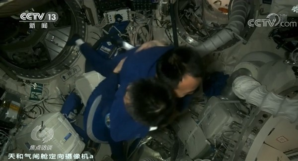 拥抱,紧紧的拥抱,在离地面约400公里的太空轨道,中国第一个在太空翻跟头的航天员费俊龙时隔17年后再上太空,热情地跟迎接他的蔡旭哲拥抱在一起,差点又翻了一个跟头。问天实验舱里洋溢着欢乐的气氛。