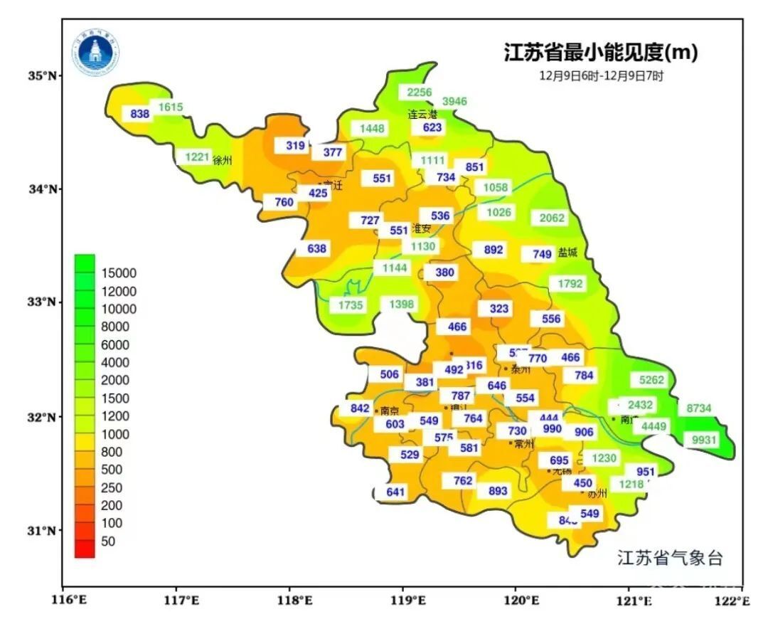 据江苏省气象台最新发布的消息,今天早上江苏省出现大范围低能见度天气。6-7时部分地区能见度不足500米。