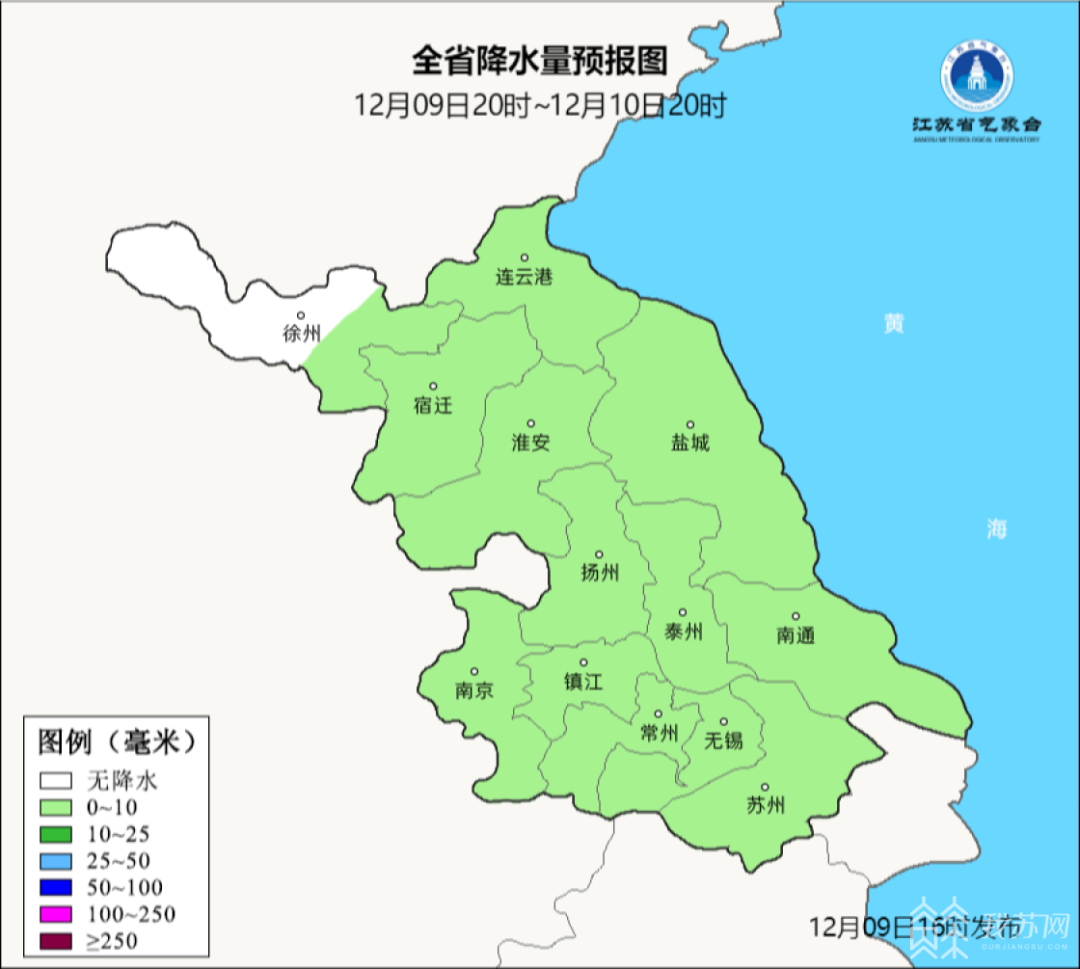 江苏省气象台2022年12月09日16时30分发布寒潮蓝色预警信号:受较强冷空气影响,预计10-11日全省自北向南有一次明显的大风降温过程,南京、徐州、连云港、宿迁、淮安、盐城、扬州、泰州、南通北部、镇江、常州的48小时最低气温将下降8~10℃,并伴有陆上阵风5-7级、江河湖海面阵风8-9级的偏北大风。