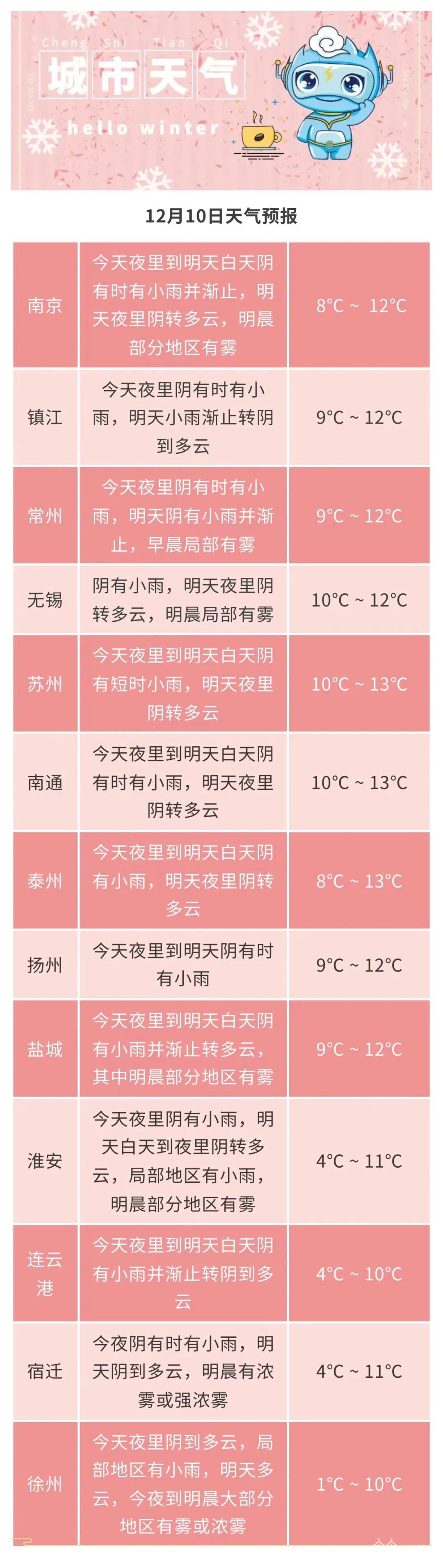 10日全省阴,大部分地区有时有小雨并渐止转阴到多云;最高温度:本省东南部地区12~13℃,淮北北部地区9℃左右,其他地区10~11℃;最低温度:沿江和苏南地区9~10℃,淮北地区4℃左右,其他地区7℃左右。全省偏北风3-4级逐渐增强到5级阵风6-7级。